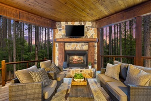 ✔ Large covered back patio a gas grill, conversation seating around the fireplace, and a tv.